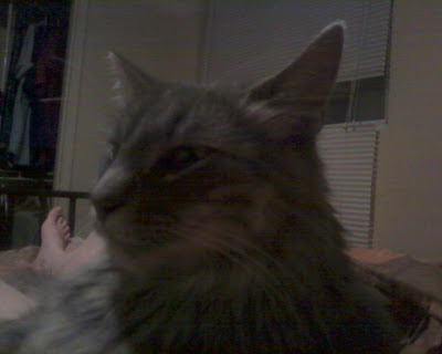 The satisfied look in his face is because he is sleeping with us. (The foot in the background is not mine but my boyfriend's.)